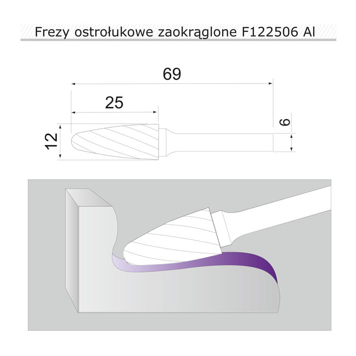 Volframikarbidista valmistettu varrellinen jyrsin, joka on tarkoitettu alumiinin ja sen seosten työstöön. Teräväkaarinen, pyöristetty työosan muoto mahdollistaa yksityiskohtien, ääriviivojen ja kulmien tarkan työstön, erityisesti kohdissa, joissa vaaditaan tarkkaa työkalun ohjausta.