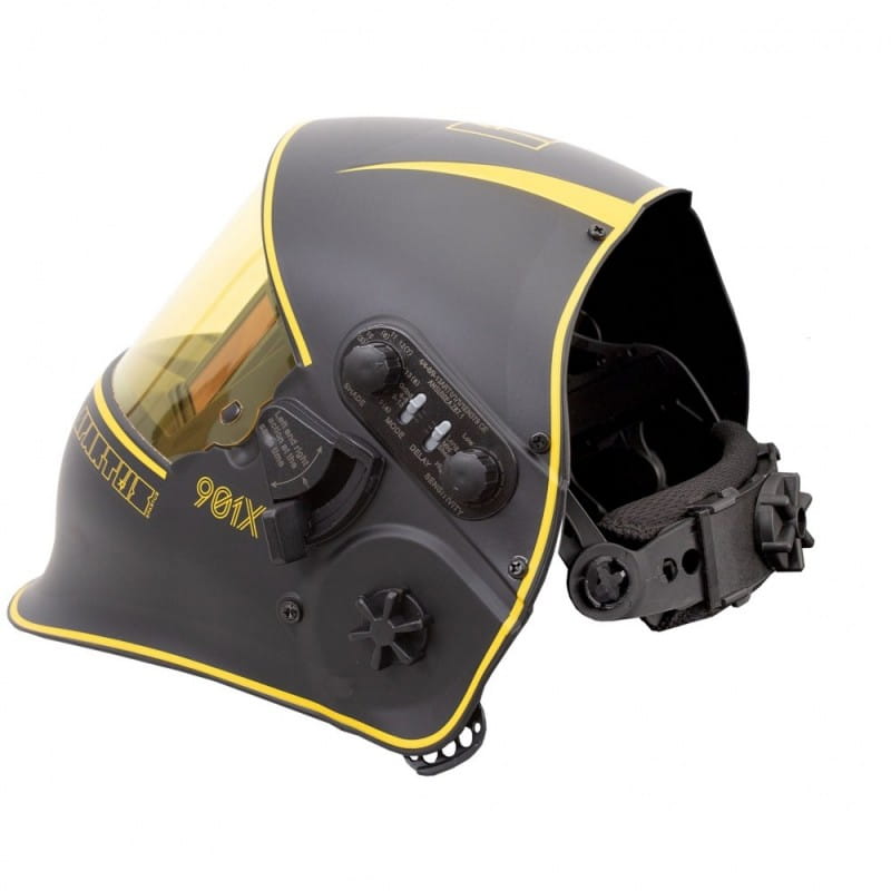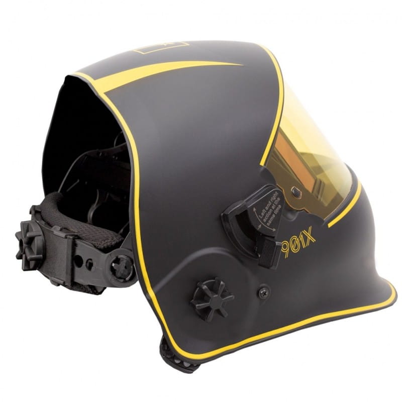 901X-kypärä on lisäksi varustettu erityisellä mekanismilla hitsaussuodattimen nostamiseen ja laskemiseen. Kun suodatin nostetaan, visiirin painopiste on alempana ja osuu pään painopisteeseen. Tämä vähentää hitsaajan niskan väsymistä ja lisää merkittävästi työskentelymukavuutta. Näkökenttä kasvaa myös – 165 x 72 mm, ja hitsaajan silmät on suojattu suojalasilla.