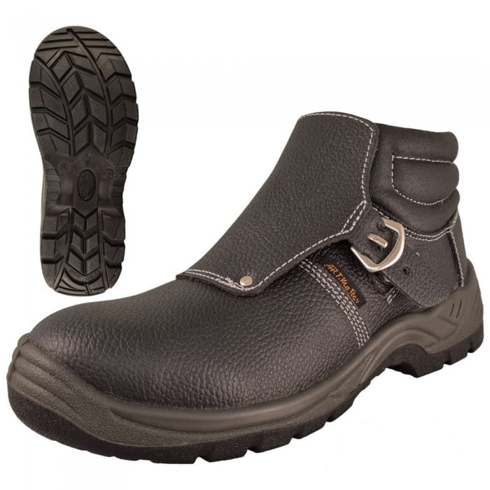 Calzatura di sicurezza con puntale in acciaio, tipo a saldare. La costruzione della tomaia è dotata di linguetta esterna per evitare che le schegge penetrino all'interno della calzatura. La fibbia di sicurezza consente di sganciare rapidamente il cinturino.