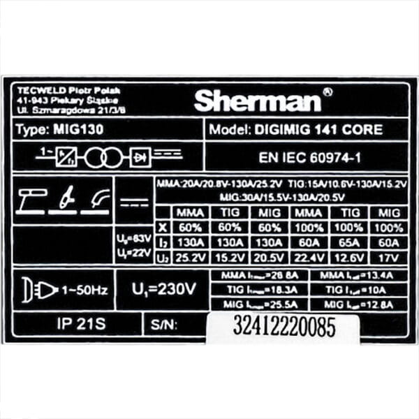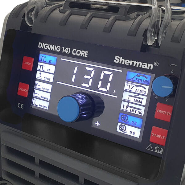 Saldatrice Inverter 130A – MIG Senza Gas + MMA + TIG Lift – Sinergico, 2T/4T, Display LED – DIGIMIG 141 CORE – Sherman