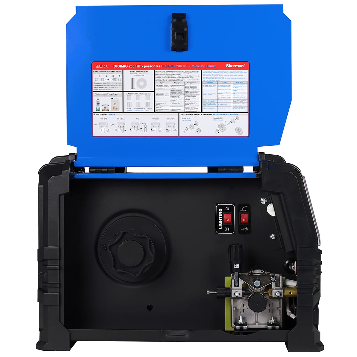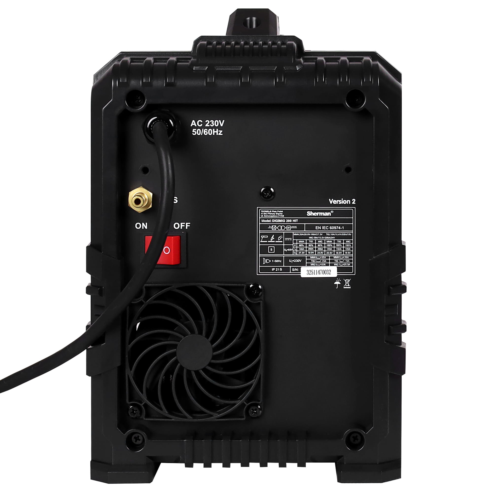 SHERMAN DIGIMIG 200 HIT è una saldatrice inverter sinergica progettata per la saldatura di acciai al carbonio, acciai inossidabili e metalli non ferrosi. Il dispositivo consente di lavorare con i metodi MIG/MAG (manuale e sinergico), MMA (elettrodo rivestito) e TIG Lift DC.