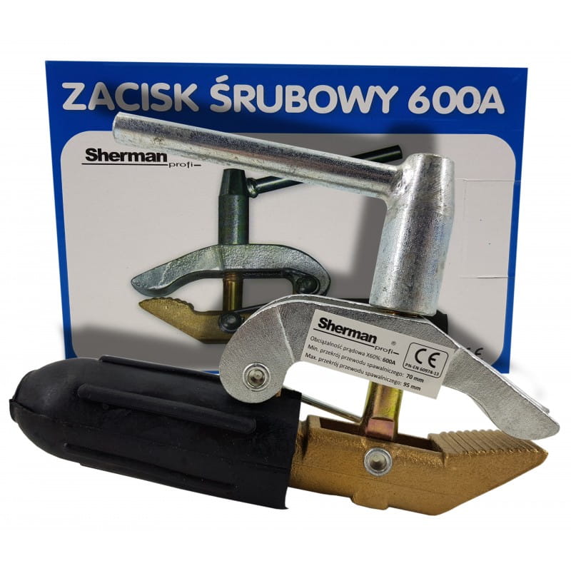 Terminali a bullone 600A utilizzati nella saldatura per fissare il filo di terra sul materiale saldato, creando un circuito di saldatura. I contatti in rame sulle pinze e la robusta molla assicurano un buon e sicuro fissaggio sul materiale saldato e una buona conduttività elettrica.
